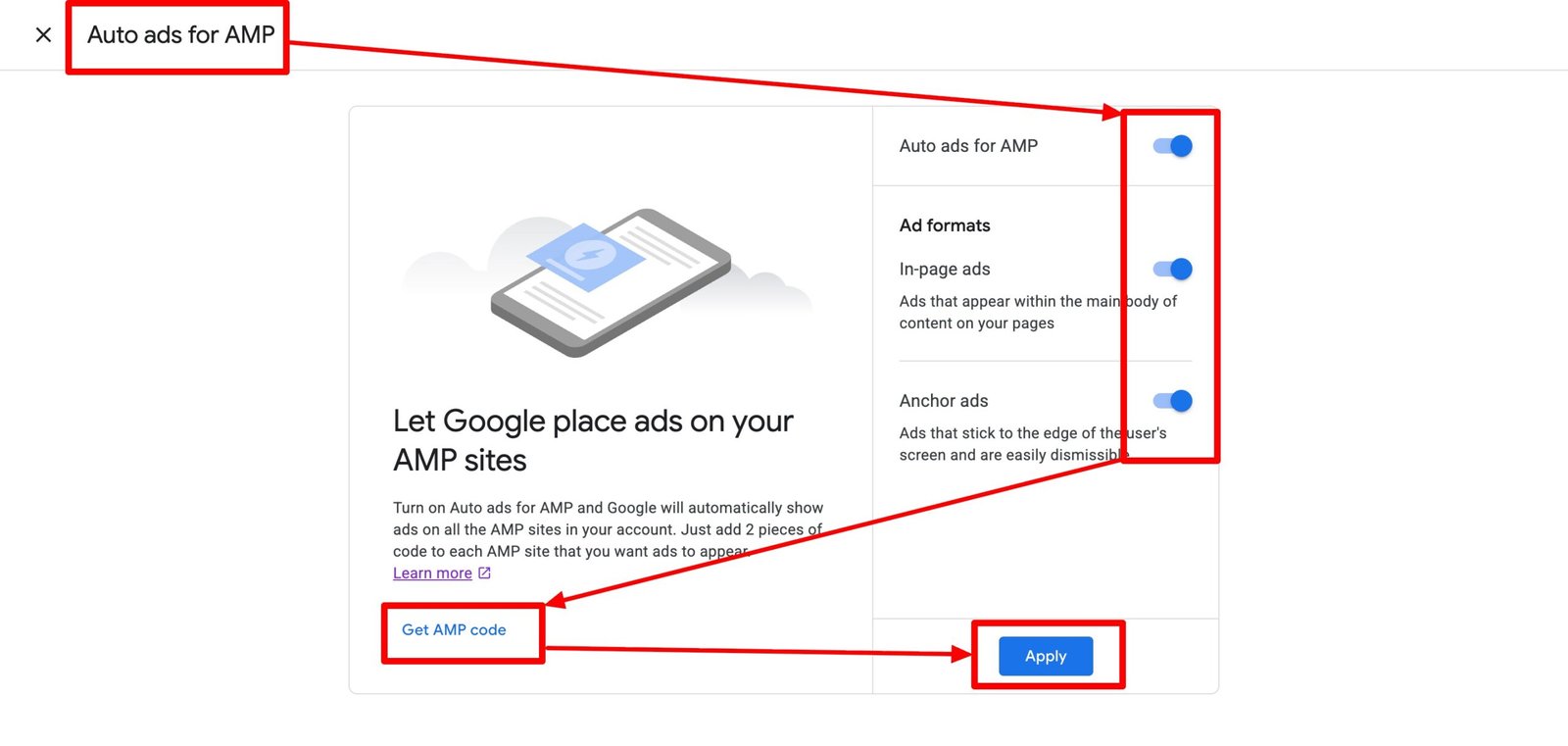 - Click Apply. It can take up to an hour for ads to appear on the page.On your Ads page, it now says “AMP is on”.